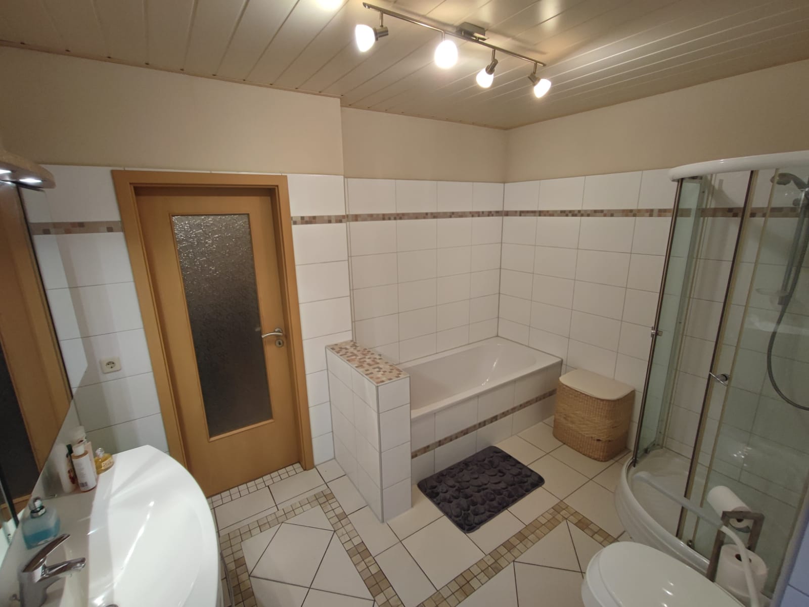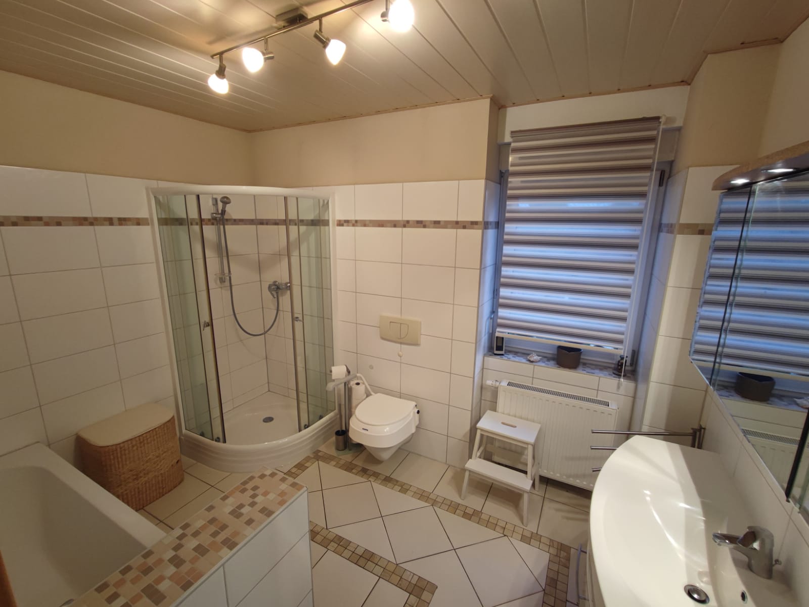 - Bad im Erdgeschoss mit Dusche, Wanne, Waschtisch und WC