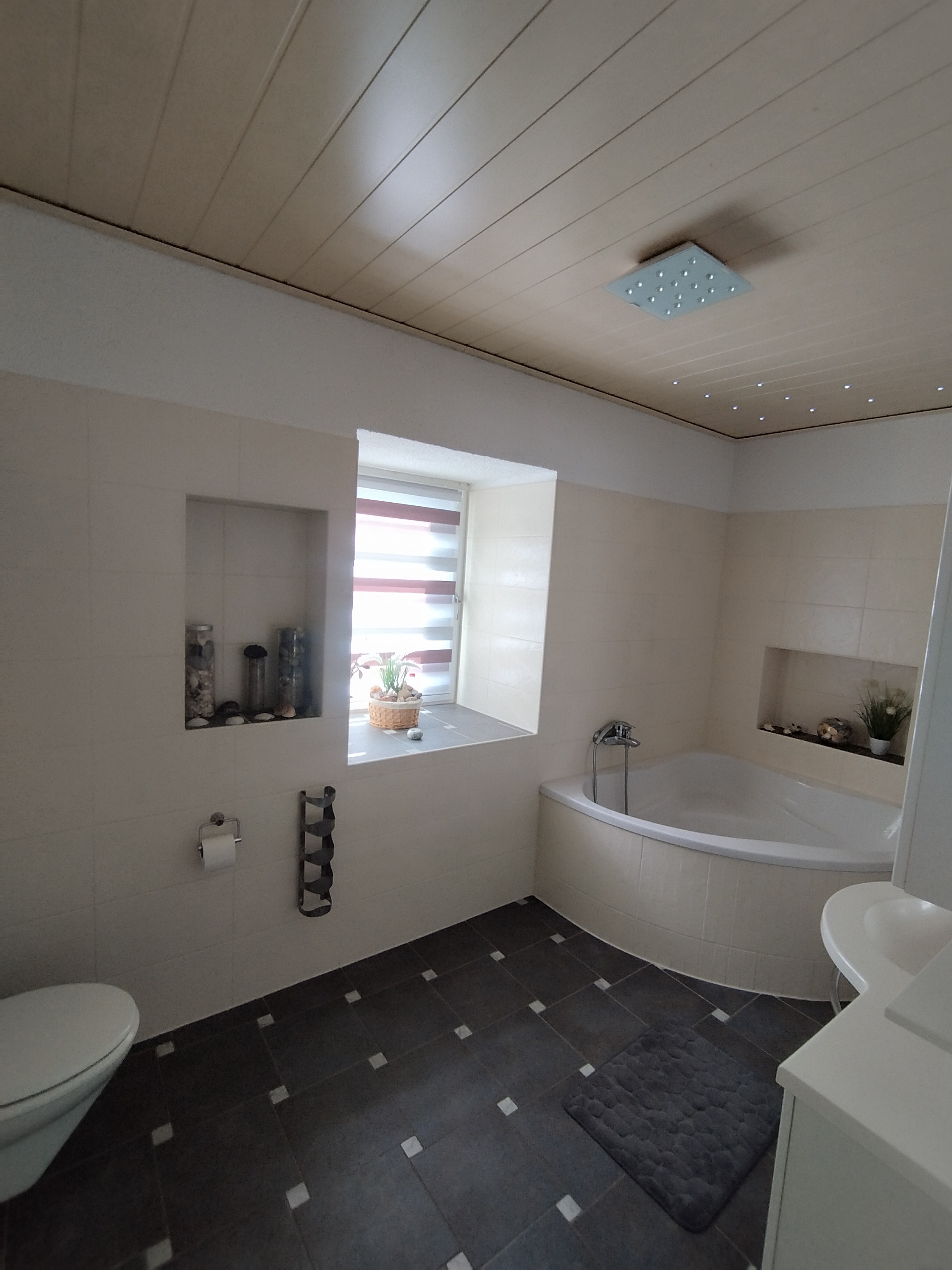 - Bad im Dachgeschoss mit Eckbadewanne, Dusche, Waschbecken, WC und separatem Gäste WC