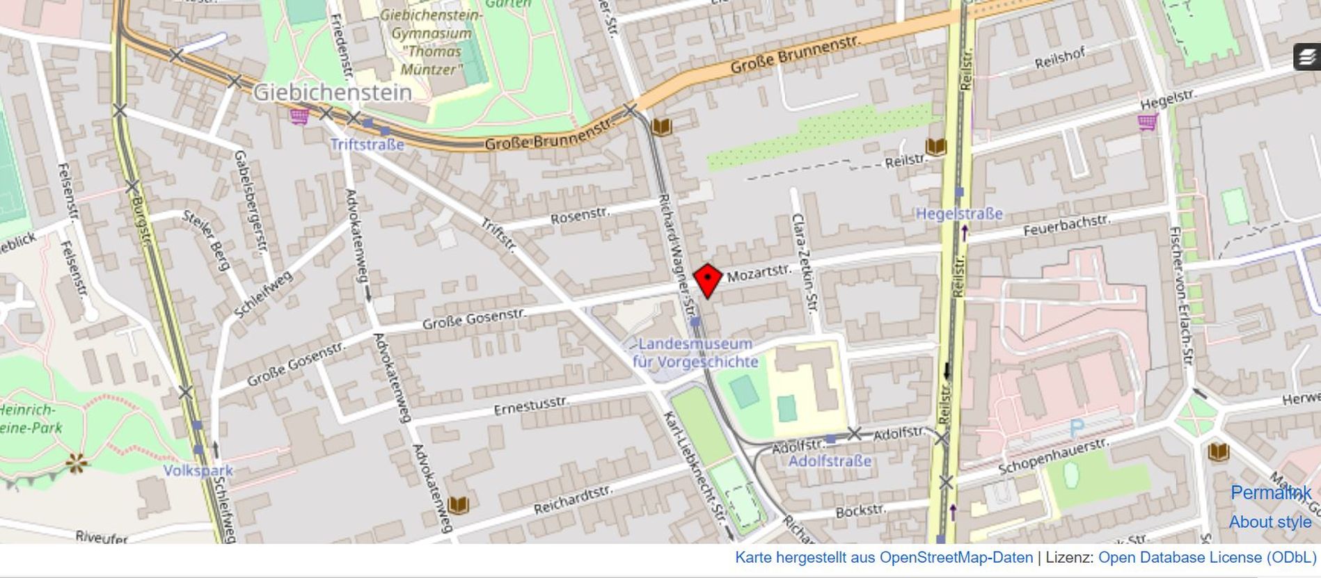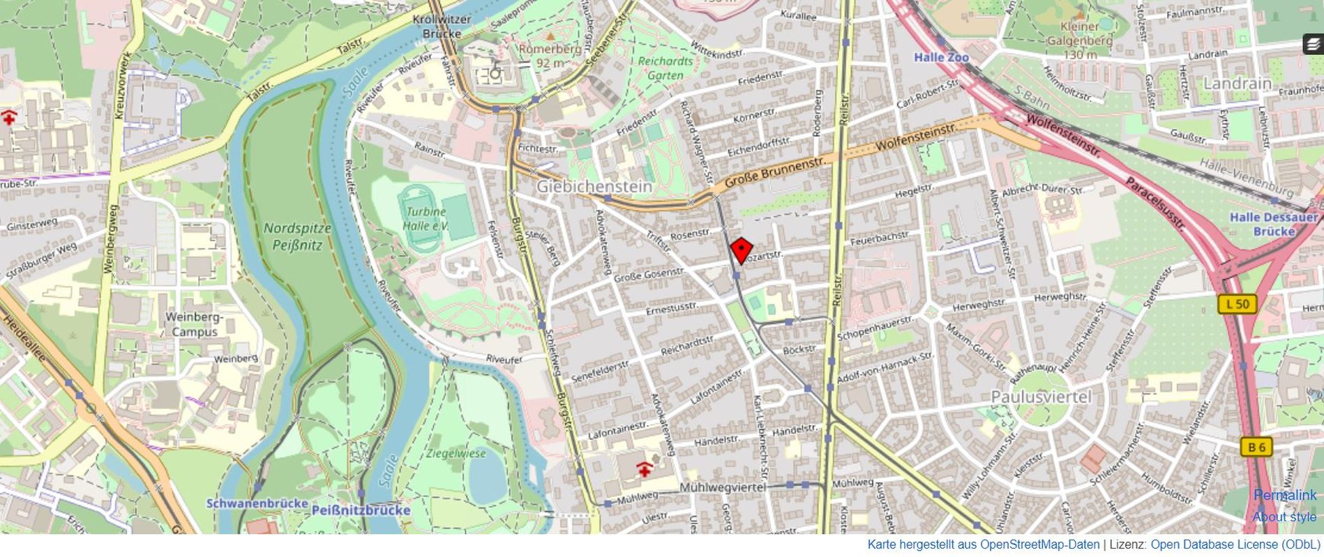 Die Wohnung befindet sich im Giebichensteinviertel, einem sehr beliebten Stadtteil im Norden der Stadt Halle/Saale, welches von Bauten aus der Gründerzeit geprägt ist. Durch die Nähe zur Saale und zu umliegenden Parks gibt es hier reichliche Möglichkeiten für eine erholsame und aktive Freizeitgestaltung. In unmittelbarer Umgebung gibt es gute Einkaufsmöglichkeiten, Schulen, Kindergärten, Ärzte und Straßenbahnhaltestellen. Auch mit dem Pkw ist eine gute Verkehrsanbindung gegeben, die Bundesstraße B 100 und die Landstraße L 145 mit Anbindungen an die Autobahn A14 verlaufen in kurzer Entfernung.
