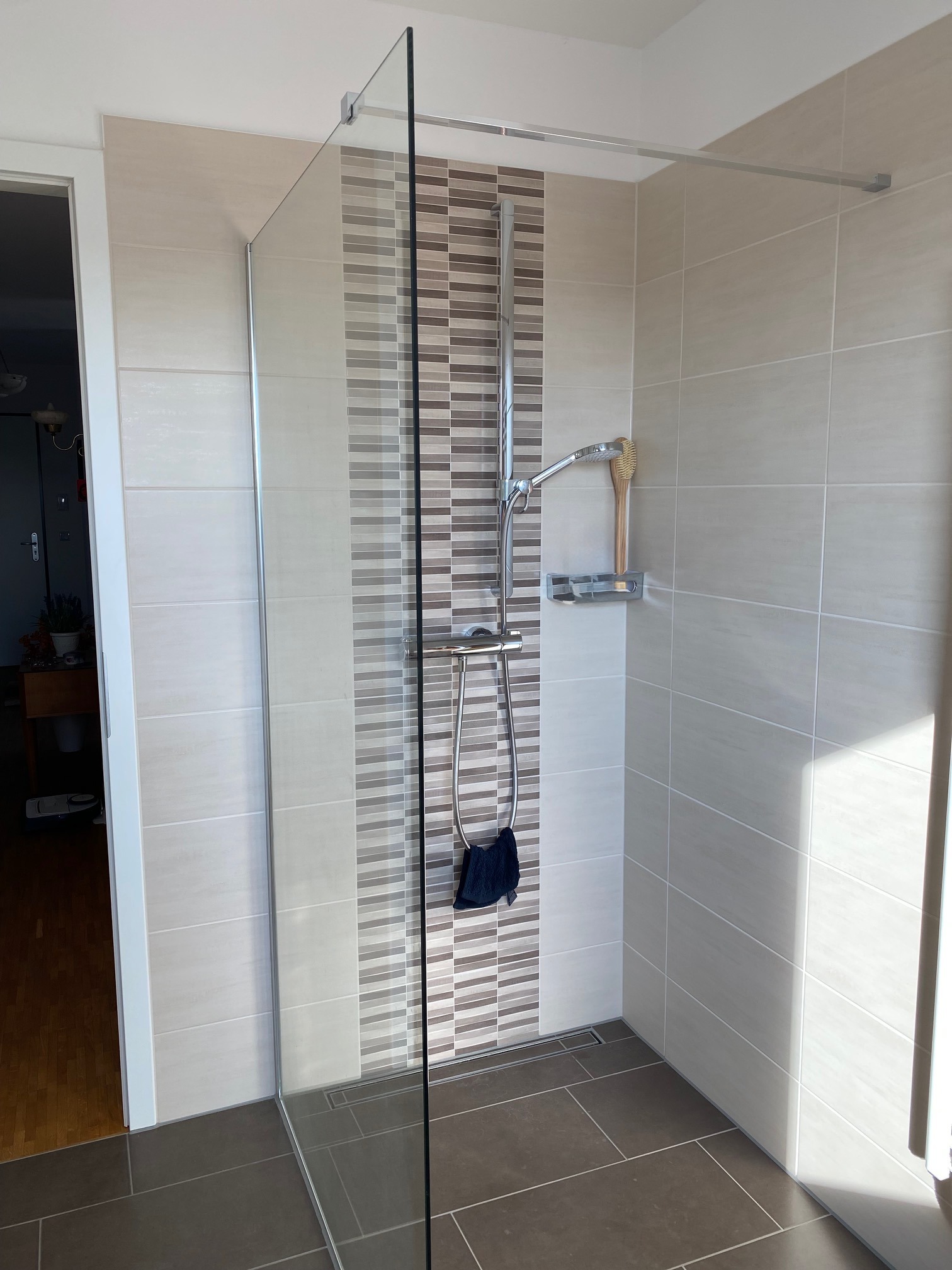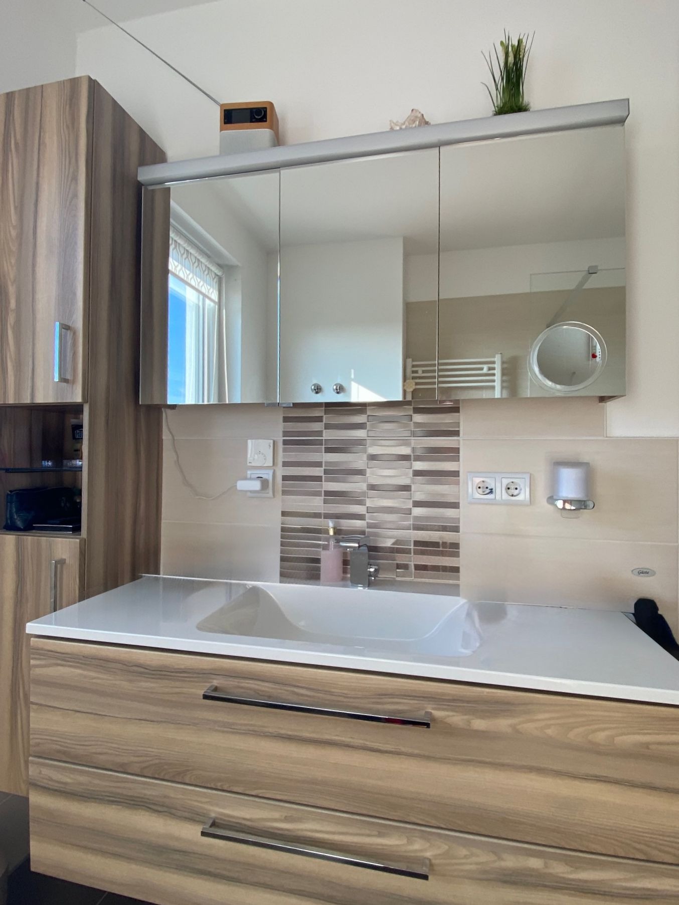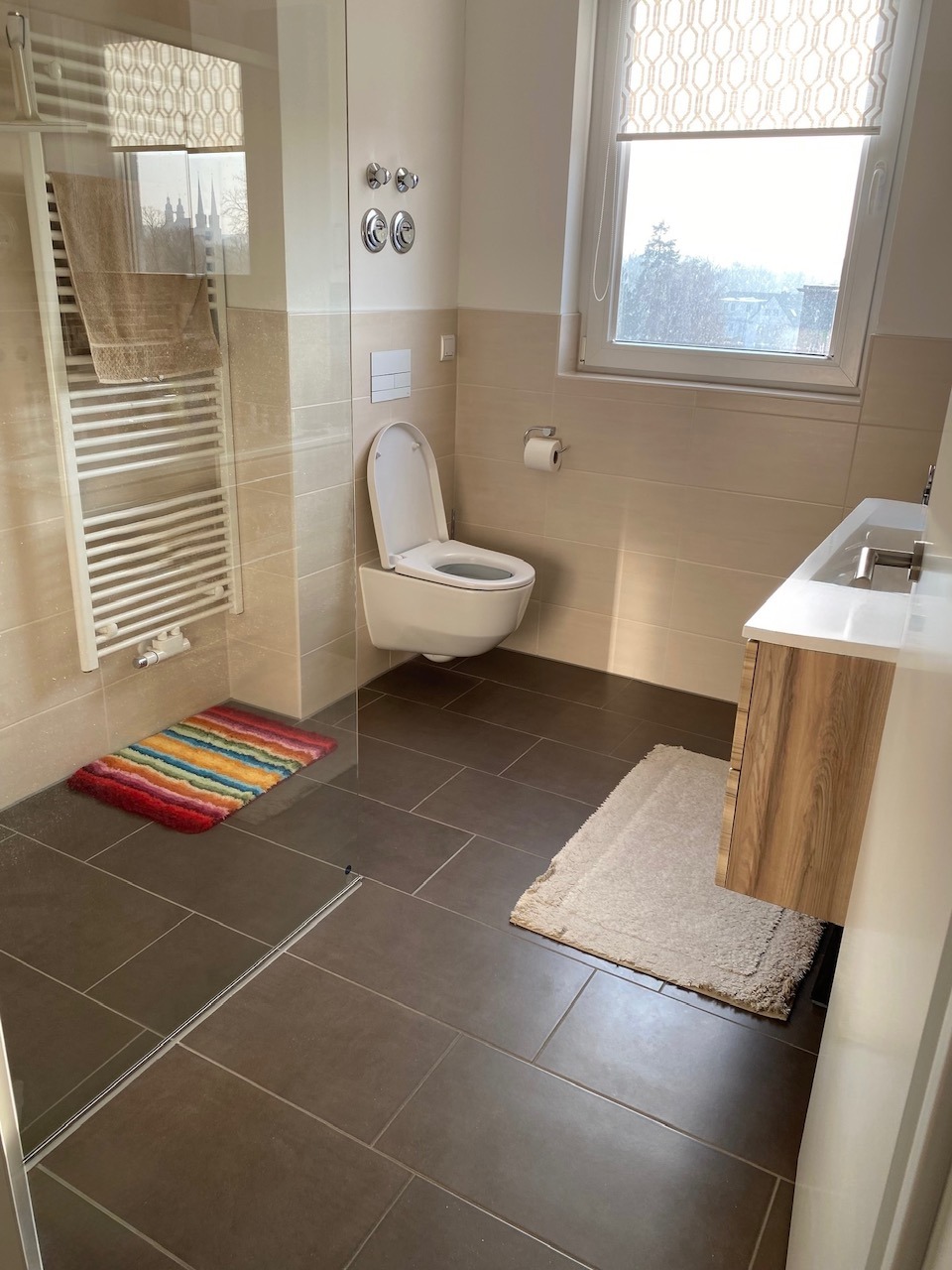 - Bad: bodengleiche Dusche, Waschbecken, WC und Handtuchheizkörper, Badmöbel