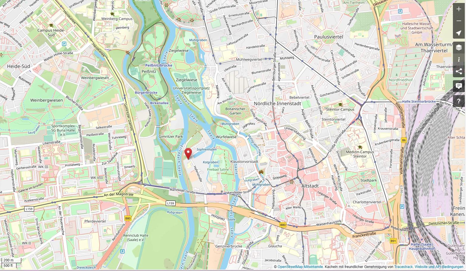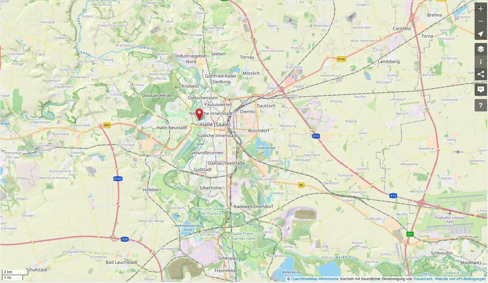 Hier wohnen Sie inmitten von Halle/Saale, wo Sie die Vorzüge einer Stadt genießen und trotzdem naturnah und ruhig leben können. Über die Hafenstraße ist eine gute Anbindung an die vorhandene Infrastruktur der Saalestadt Halle gewährleistet. Zu Fuß erreicht man in ca. 8 min. die Straßenbahnhaltestelle.