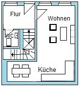 Die Wohnung verfügt über ein Wannenbad sowie ein separates Gäste-WC und bietet damit einen komfortablen Grundriss für unterschiedliche Wohnbedürfnisse. Durch ein Oberlicht ist die Küche im EG mit Tageslicht versorgt.