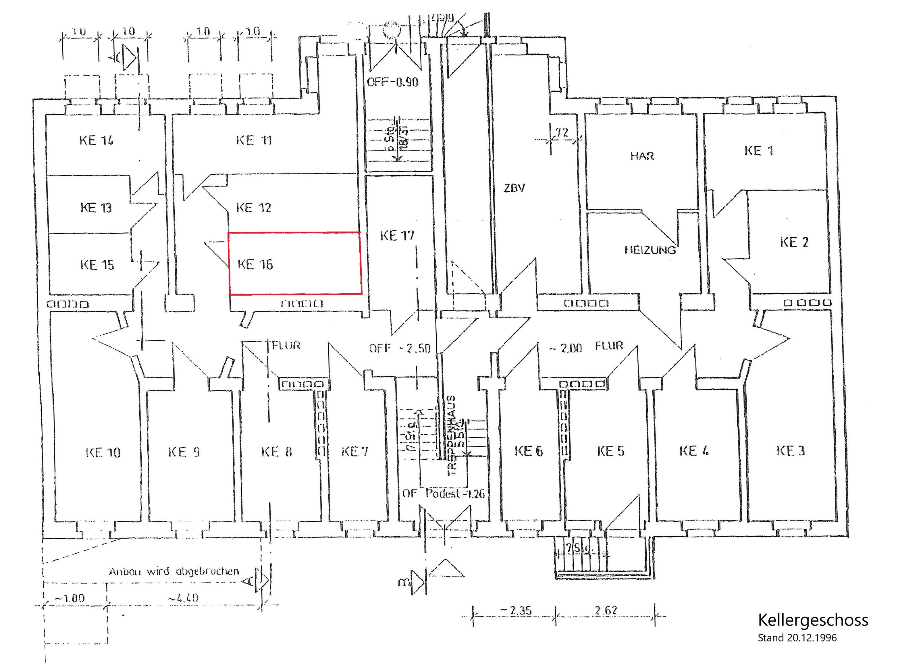 Die Wohnung verfügt über einen Flur, von wo aus man das innen liegende Tageslichtbad, das Schlafzimmer einem Abstellraum und das Wohnzimmer mit einem offen gestalteten Kochbereich erreicht. Hervorzuheben ist der vor dem Gebäude befindliche Vorgarten, der einen schönen grünen Abstand zum Fußweg und zur Straße bildet. Im Kellergeschoss gibt es ein Kellerraum für Abstellzwecke.