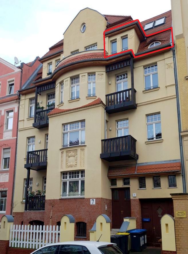 Die gemütliche Zwei-Zimmer-Wohnung befindet sich im Dachgeschoss im Vorderhaus eines ca. 1900 erbauten und 1998 sanierten, denkmalgeschützten Mehrfamilienhauses mit 21 Wohneinheiten. Die Wohnung bietet ein Wohnzimmer mit Zugang zu einem Küchenbereich, ein zum Hinterhof ruhig gelegenes Schlafzimmer, ein innenliegendes Bad und einen Flur. Für Abstellmöglichkeiten ist der Immobilie ein Kellerraum zugeordnet.