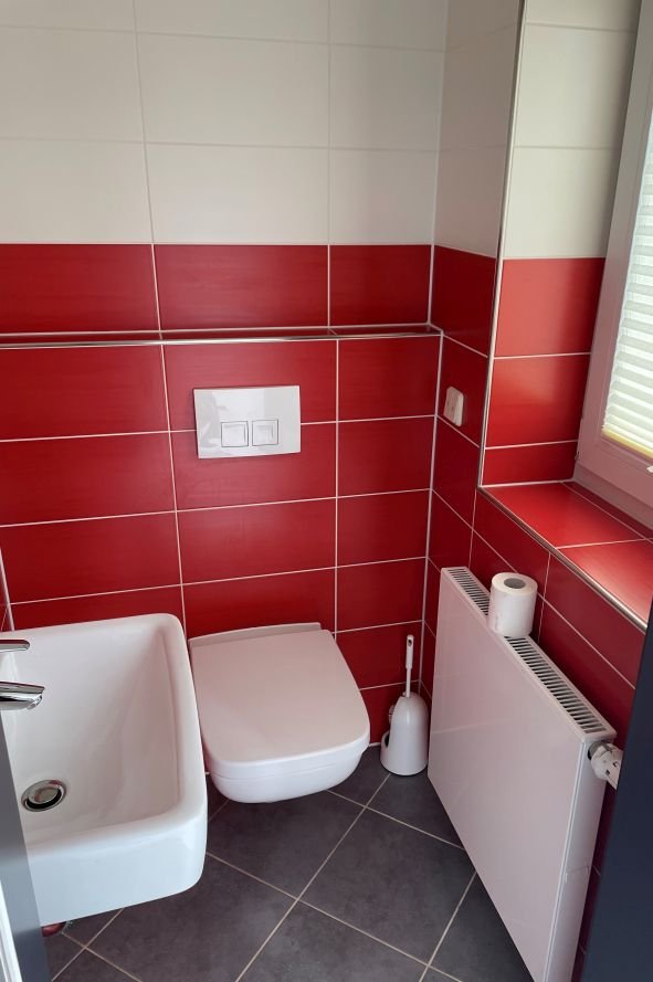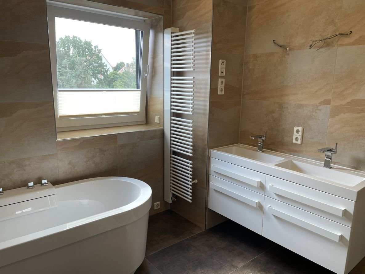 - Bad mit Wanne, Dusche, Handtuchheizkörper, Doppelwaschbecken mit Unterschrank, WC und Fußbodenheizung