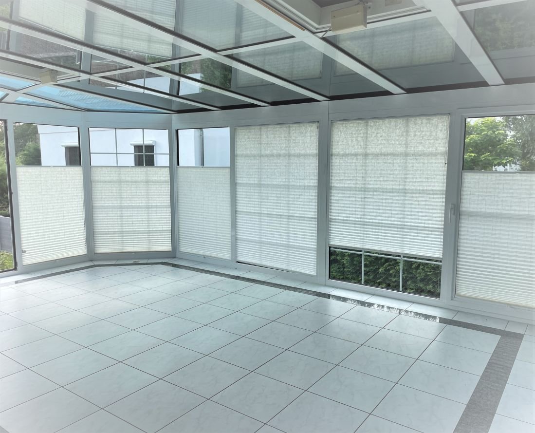 - beheizter Wintergarten mit Außenmarkise zur Beschattung des Daches und Plisseerollos an den Glaselementen
