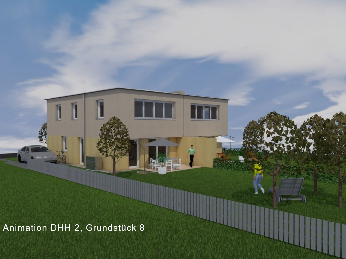 Dieses Angebot bezieht sich auf die Doppelhaushälfte 2 auf dem Grundstück Nr. 8 (siehe Gestaltungsplan). Das Gebäude mit ca. 119,30 m² Wohnfläche wird massiv auf einem ca. 297 m² großen Grundstücksanteil gemäß Gebäudeenergiegesetz (GEG) als Standardhaus (KfW 55) errichtet. Die Doppelhaushälfte besteht aus einem modernen 2-geschossigen Baukörper mit massivem Flachdach und stellt sich wie folgt dar: