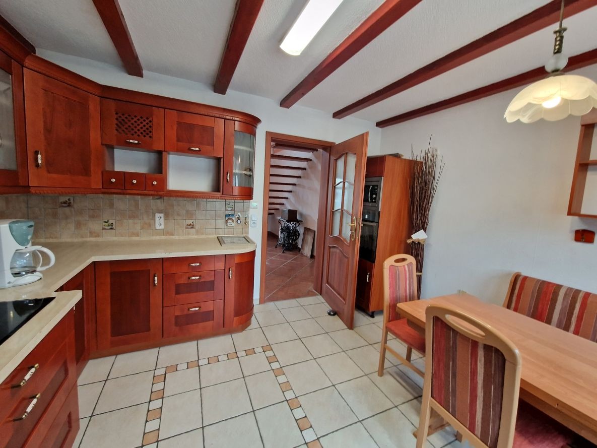 - Küche mit Zugang zum Garten und dekorativen Holzbalken, farblich abgestimmt mit der im Objekt verbleibenden hochwertigen Einbauküche