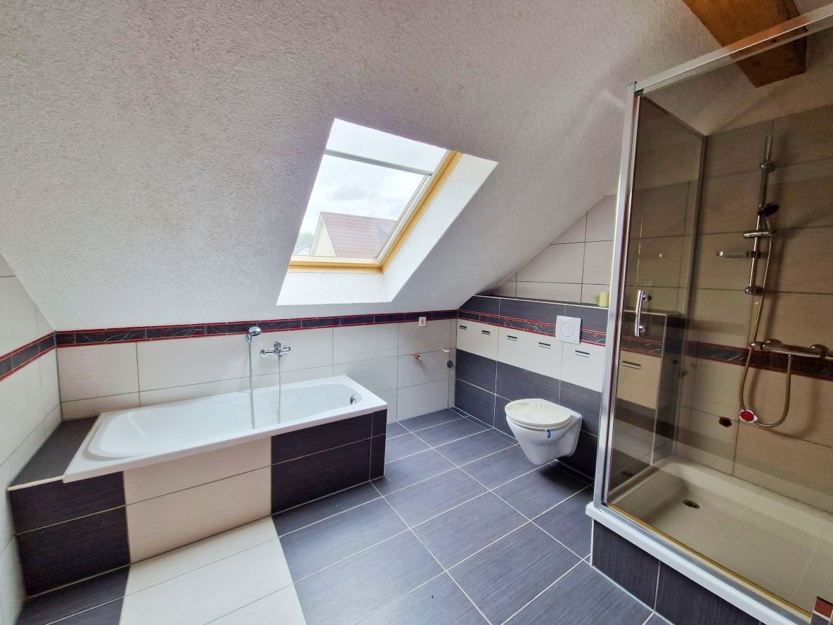 - Bad im Dachgeschoss mit Wanne, Dusche, WC sowie Anschlüssen für Waschbecken und Waschmaschine