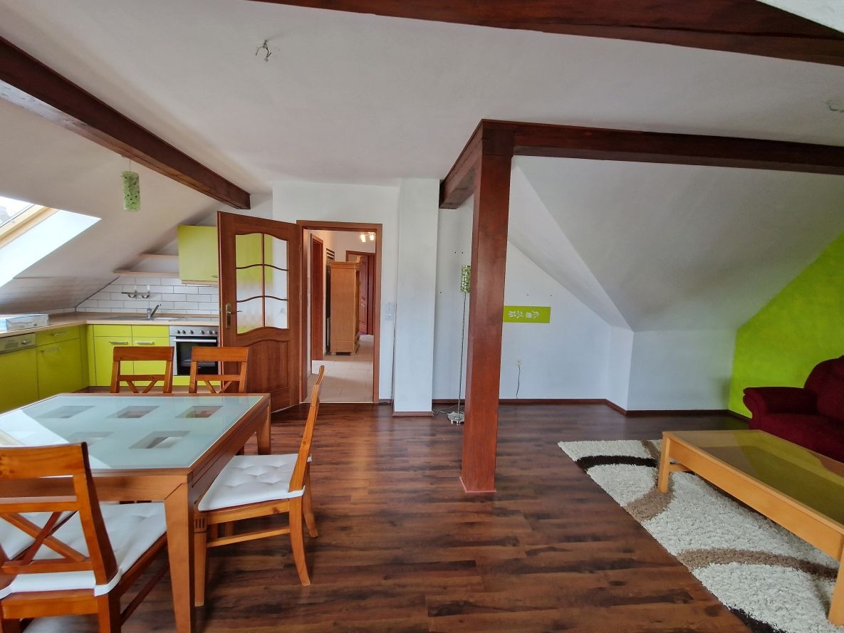 - geräumiges Zimmer mit sichtbaren Holzbalken und offen gestaltetem Küchenbereich