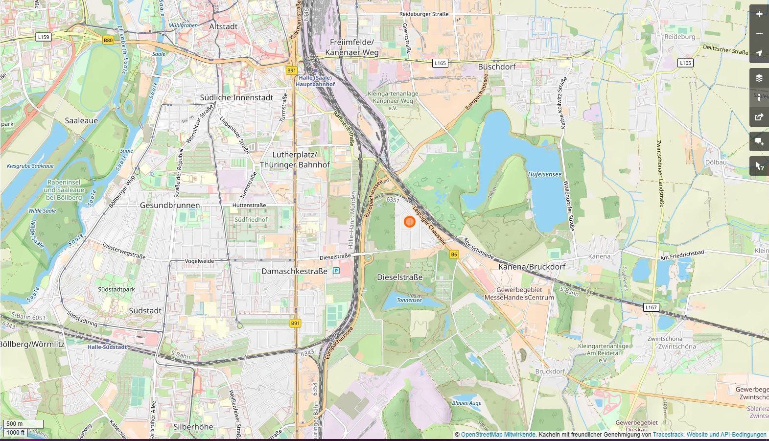 Die Immobilie befindet sich im Süd-Osten von Halle (Saale) im Stadtteil Dieselstraße in der sogenannten Kompottsiedlung, in einer gepflegten und von Einfamilienhäusern geprägten Wohngegend. Es besteht durch die nahe gelegene Bundesstraße 6 und der Europachaussee eine gute Verkehrsanbindung ins gesamte Stadtgebiet und ins Umland. Auch die BAB 9 und 14 sind nur ca. 15 bzw. 10 Fahrminuten entfernt. Den Halleschen Einkaufspark in Bruckdorf mit vielen verschiedenen Einkaufsmöglichkeiten erreicht man nach ca. 1 km und in etwa gleicher Entfernung hat man am Hufeisensee die Möglichkeit für eine erholsame Freizeitgestaltung. Weiterhin besteht eine gute Anbindung an den öffentlichen Personennahverkehr, bis zur Bushaltestelle benötigt man weniger als fünf Gehminuten, der Hauptbahnhof ist ca. 2,5 km entfernt.