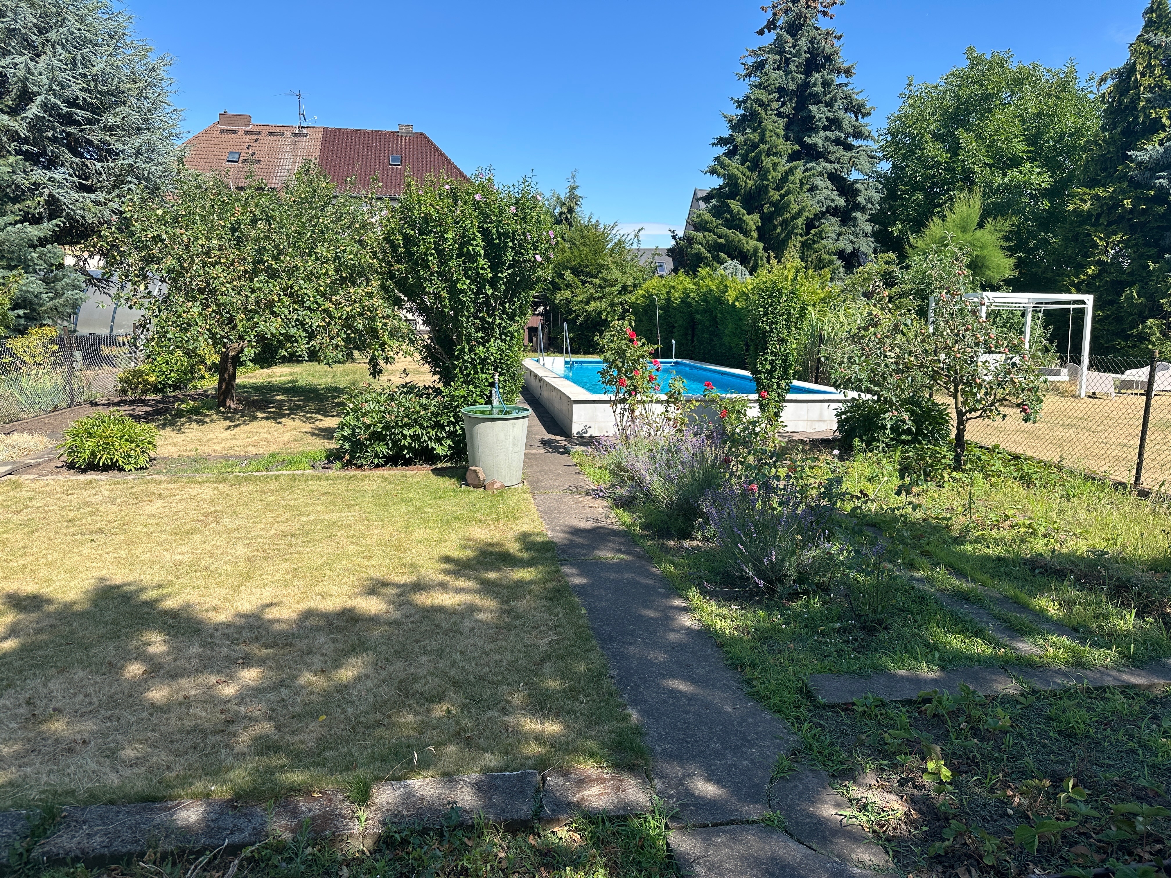 Das gepflegte und großzügige Grundstück in Ost-Westausrichtung ist komplett mit Hecken und Zäunen umfriedet. An warmen Sommertagen bietet ein Außenpool eine Erfrischung und ein überdachter und gepflasterter Sitzbereich lädt zum Verweilen ein. Hier kann man es sich nach getaner Arbeit gut gehen lassen und die Kinder haben genügend Freiraum zum Spielen und Toben.